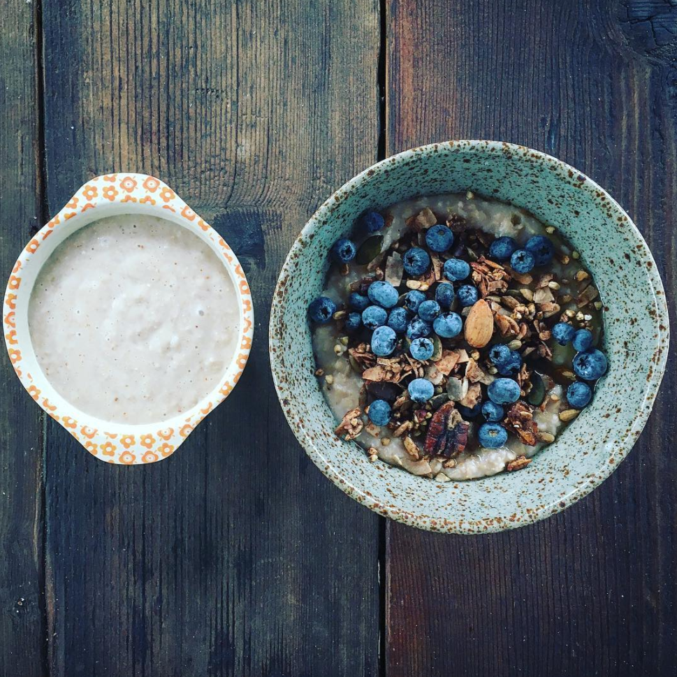 It keeps changing as he gets older but in the beginning I started with grounding foods like pureed pumpkin with coconut oil and egg yolk, or sweet potato and carrot with ghee. He absolutely loves porridge (and so do we) so that’s our go-to breakfast every morning. I just cook the oats with a pinch of cinnamon and cubed apple or pear. Once it’s cooked after a few minutes, I leave it to steam for a few more minutes so it softens. I then add a spoon of almond butter and give it a quick blitz. It’s so delicious I have to make a double batch to stop myself from eating his!